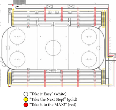 To complete this workout, you will need stairs and wall space for each student. Our community multiplex (ice rink/arena) is open seven days a week for people to walk. It is a great option because you are sheltered on rainy days, you have access to the stairs to increase the intensity of your workout, you are introducing students to a community recreational facility, and yes, it’s free!
